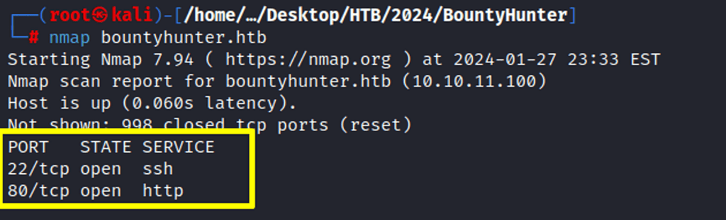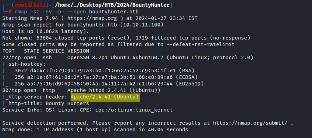 Shows port 80 runs Apache 2.4.41 Ubuntu, however, port 22 (SSH) can’t be target at the moment until creds are acquired.