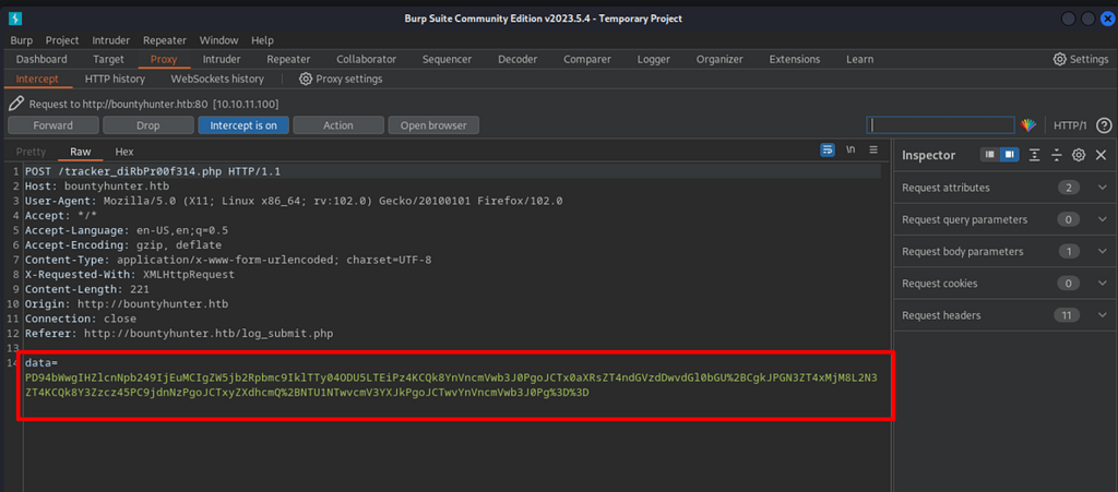 Proxy enabled, intercepting the traffic, there is parameter ‘Data’ in base-64.