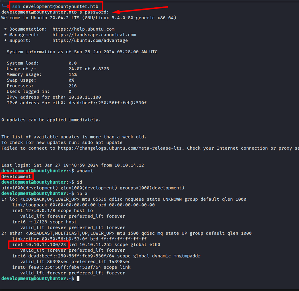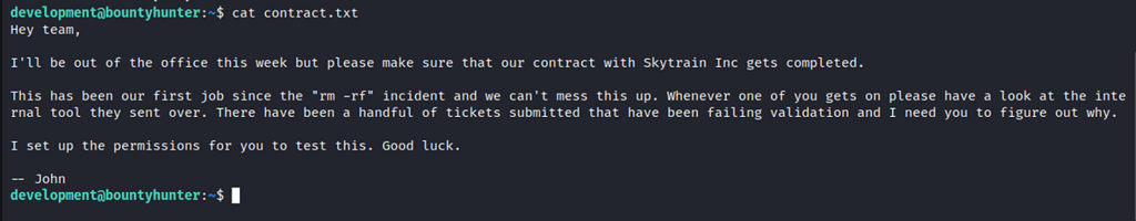 Found the file contractor.txt on the development home directory — talking about skytrain project — mentioning and development user has granted access to test the application.