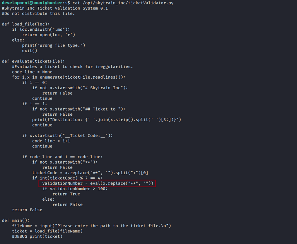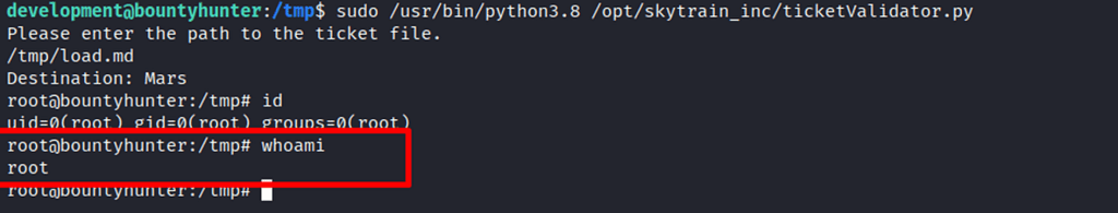 Passing the load.md file when running the ticketValidator.py script, grants privilege escalation to system user — root.