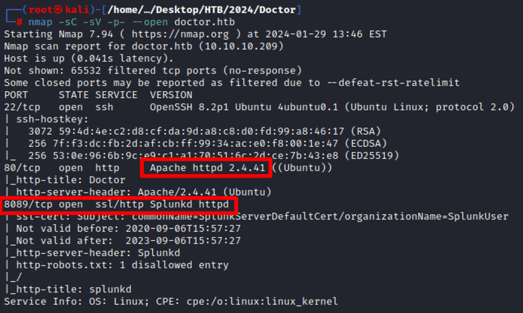 Shows port 80 runs Apache 2.4.41 Ubuntu, however, port 22 (SSH) can’t be targeted at the moment until creds are acquired. Port 8089 seems https and quite interesting – I will dig in later.