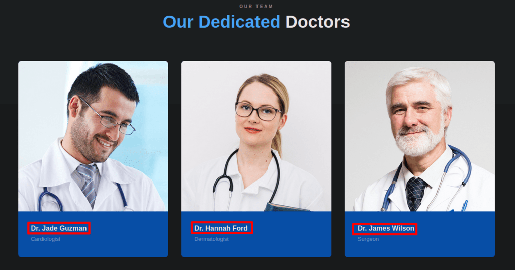 Visited web home and sub-pages, source-code, and list of doctors were displayed under “Our Team” which can be possible users.
