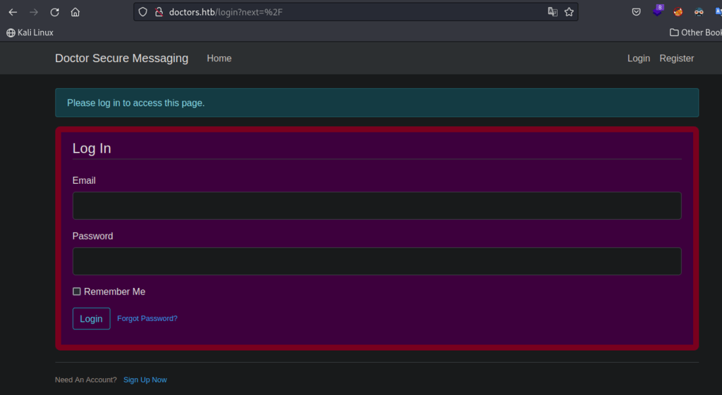 Upon visiting the http://doctors.htb, my traffic was redirected to a login page, Fantastic! Some progress finally. The login page often is subject to many types of injection and brute-forcing attacks. However, I like to test the web functionality and sign up with a new random user – Jullien.