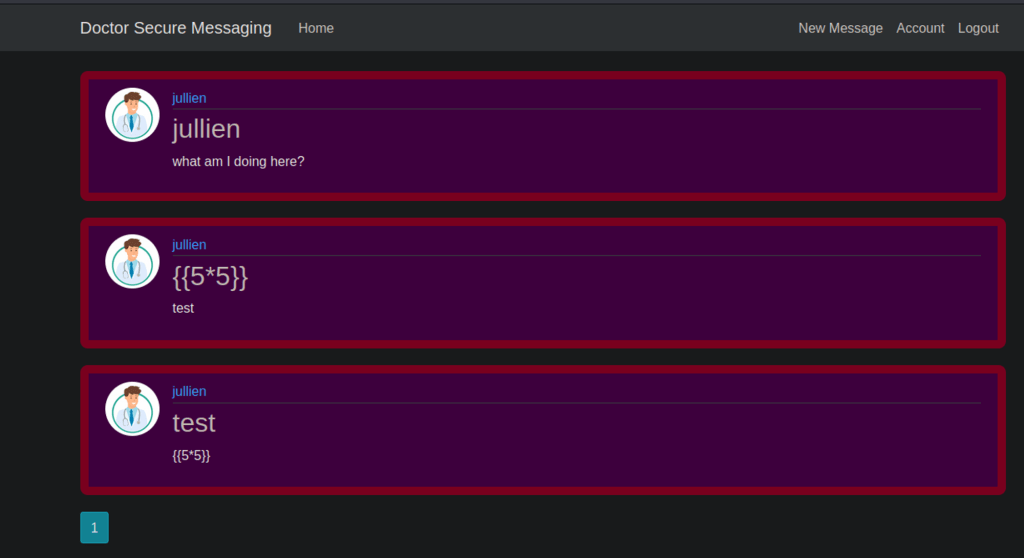 Logged in as made-up user Jullien, the interface allows the user to create messages, so I create some messages – injection code STTI payload along, but my code is not interpreted.