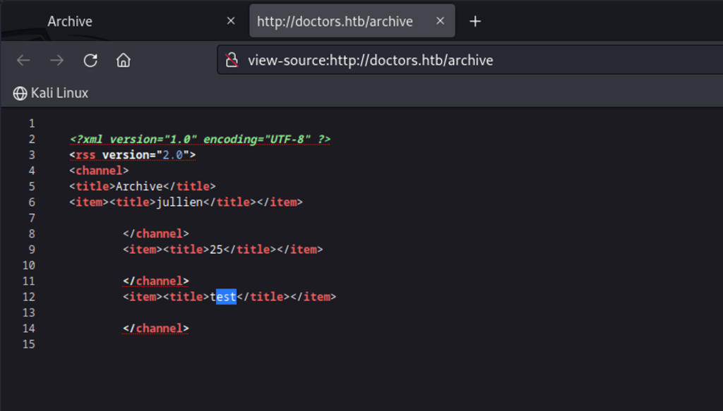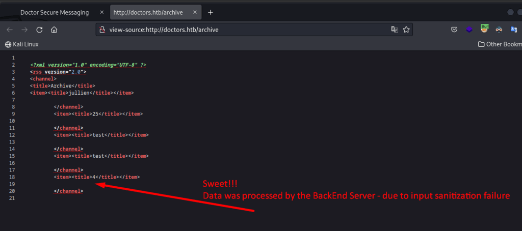 Visiting /archive, there is nothing, checking /archive source code, I see XML codes, but where did the 25 come from? Ah I see, my payload from earlier (when creating a new message) is interpreted here. OK, we have STTI code execution.