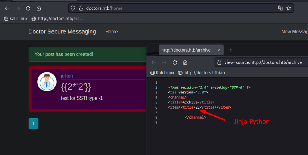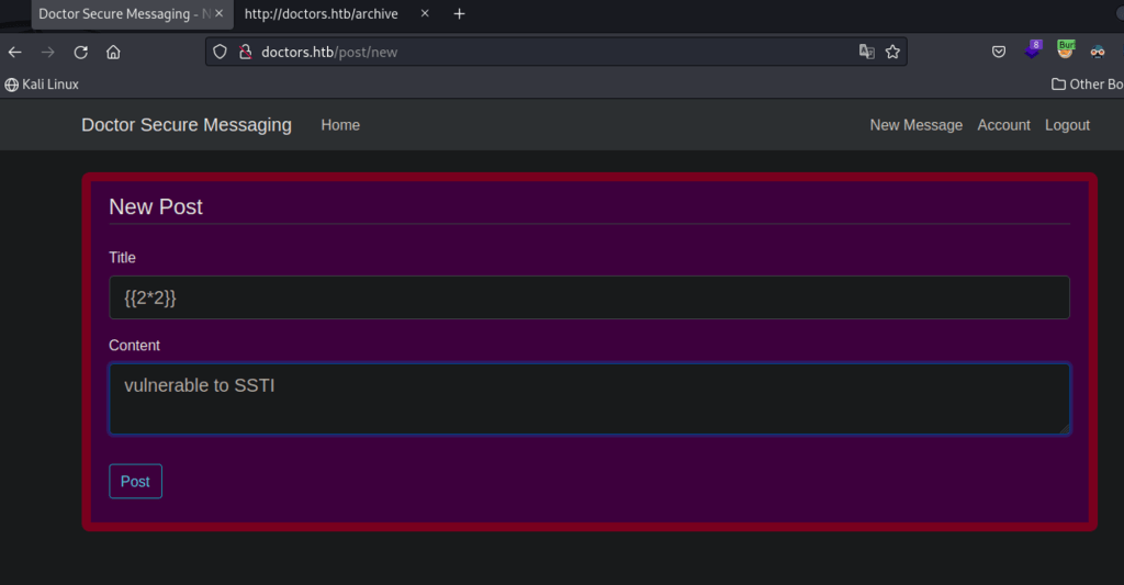 Going back to my SSTI injection while making the new message post – simple 2*2 addition.