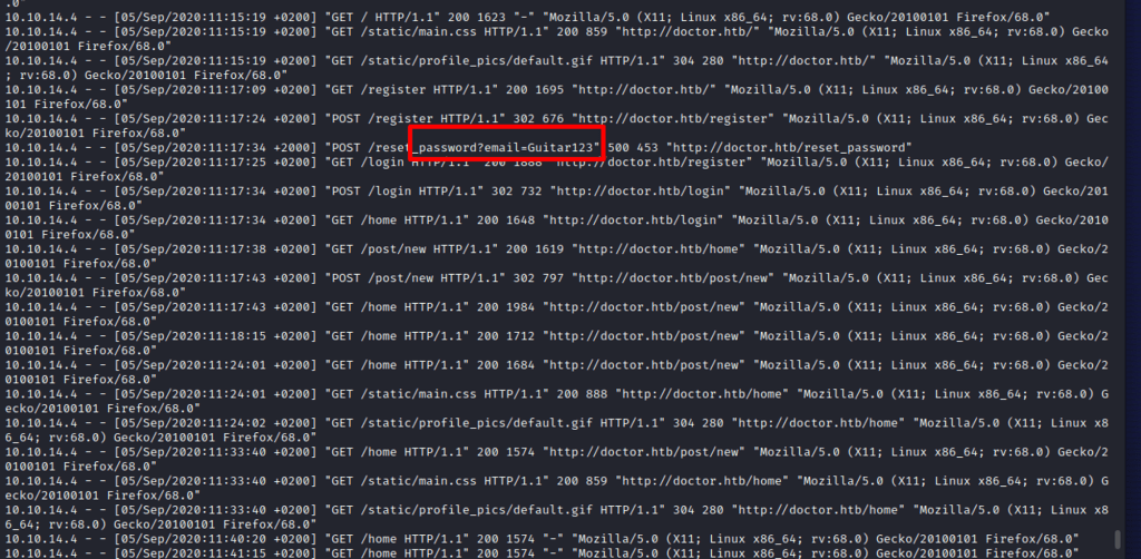 Looking around, for all possible vulnerabilities and misconfigurations, I found the backup directory under Apache logs – which the web admin has access to read weblogs. Reading the log, I spotted the string that contained the word password reset value – Guitar123. Maybe it will authenticate Shaun and grant us further access… fingers are crossed.