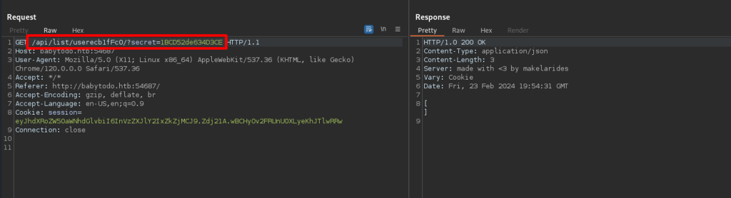 Reviewing the requests intercepted via burp, shows the request being made to specific endpoint with a secret value.