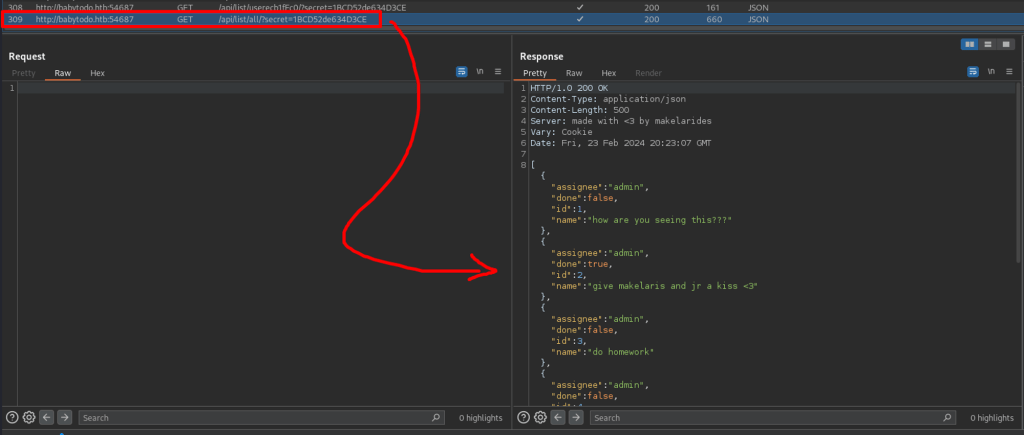 Visiting the ‘all’ endpoint discloses the tasks and to-do-lists of the users, as we shouldn’t be able to access or read.