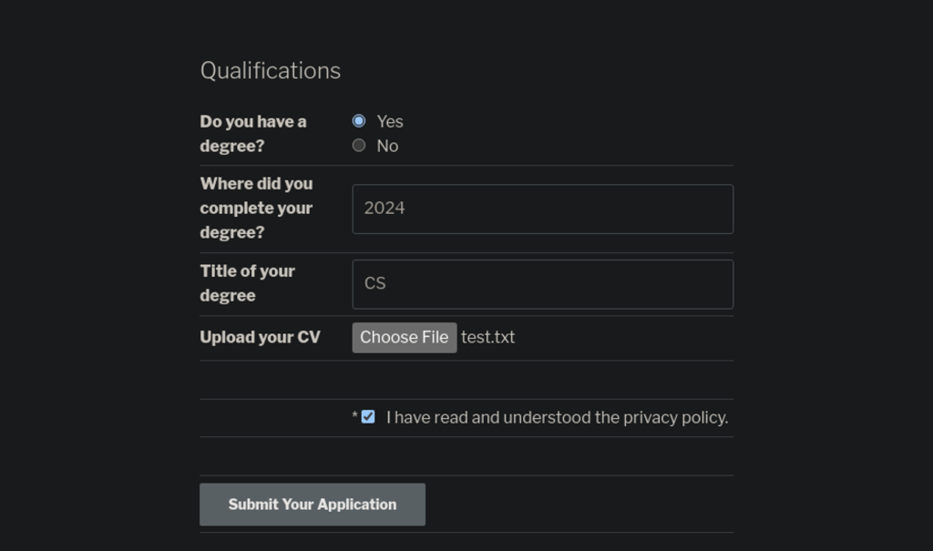 I created a profile – bob – and applied for the job Pen Tester, where instead of cv I uploaded test.txt. So I should be able to access test.txt or HacketGrantedAccess somehow via IDOR.
