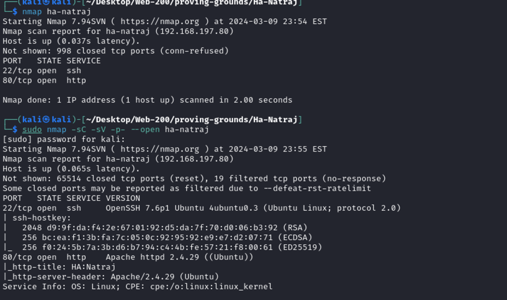 A brief Nmap scan reveals ports 22 and 80 are open.