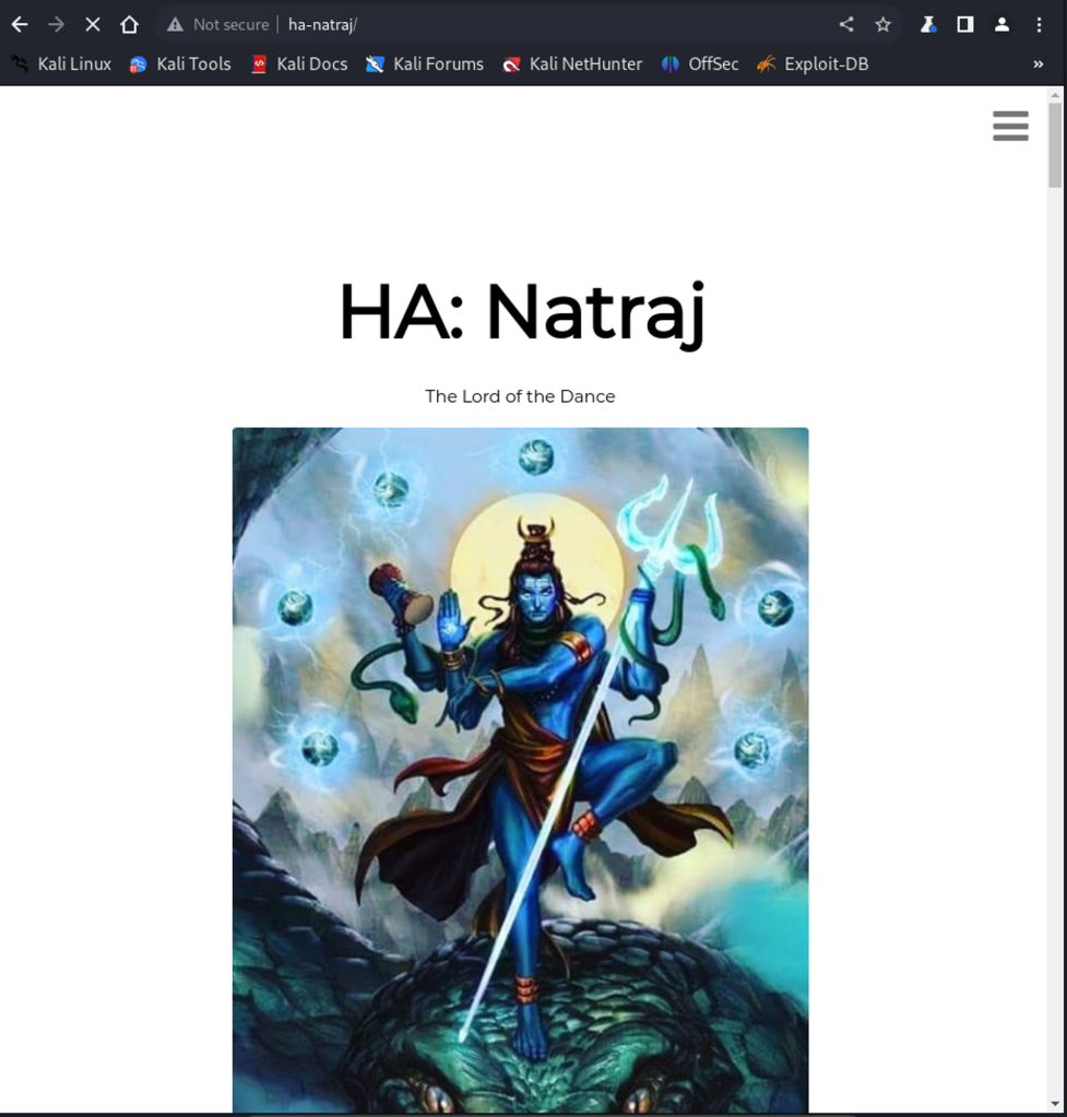Navigating to target web application, having burp to save the requests in the background. The web page seems like a religious website with many texts toward the end of the page about Natraj.