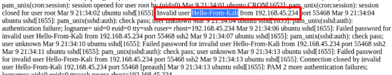 Perfect, my message has been logged, confirming that I can inject lines to the auth log.