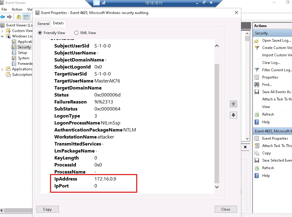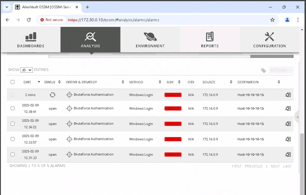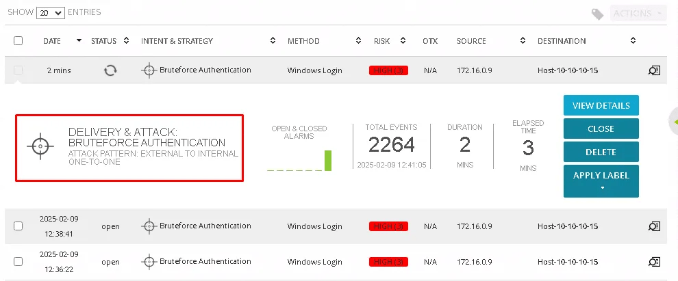 From the generated alarm, we can see the attacker’s IP address (172.16.0.9), the destination IP address (10.10.10.15, belonging to the Marketing Department computer), the risk rating (HIGH), the intent and strategy (Brute-force Authentication), and the method used (Windows Login).