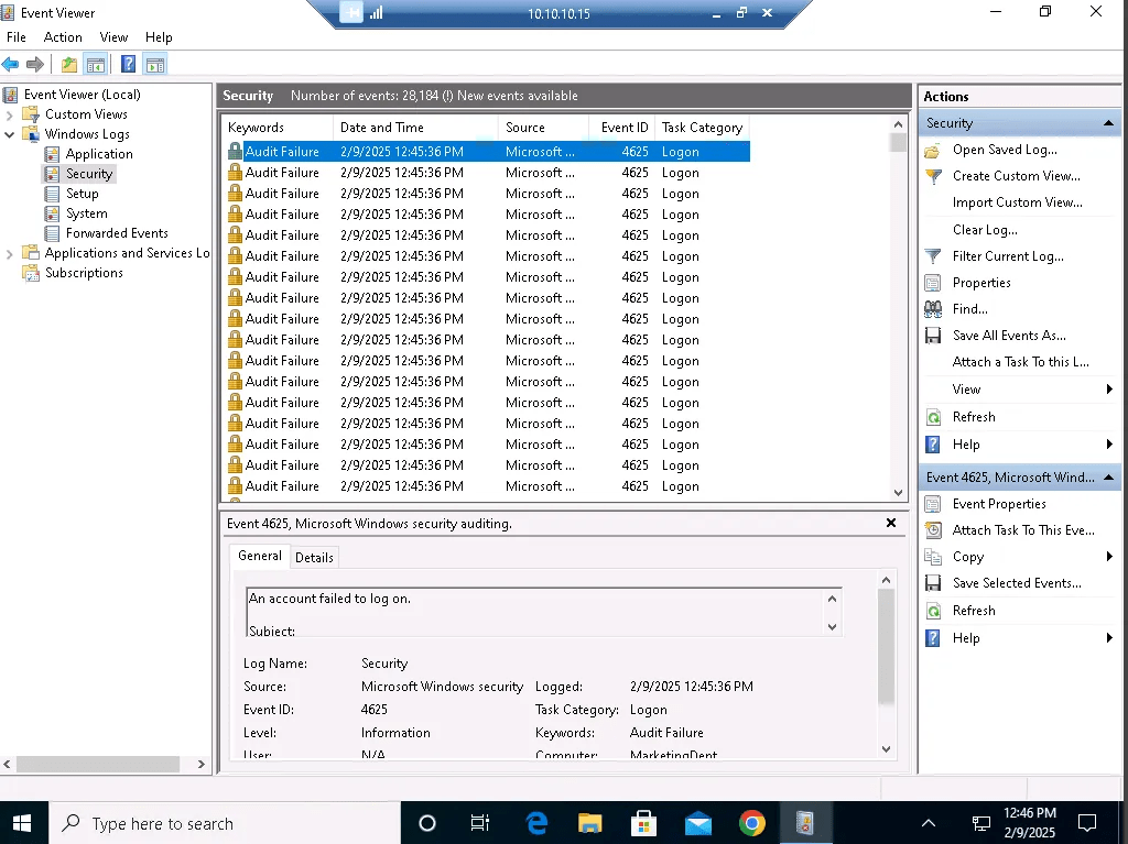 This confirms that IP address 172.16.0.9 is being used to perform a brute-force attack on the Marketing Department workstation.