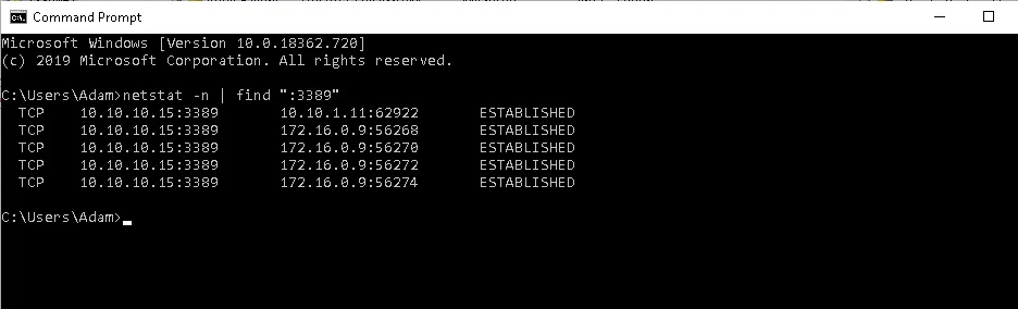 Via the target machine > Command Prompt window > type netstat -n | find “:3389” | find “ESTABLISHED” to view incoming RDP connections.