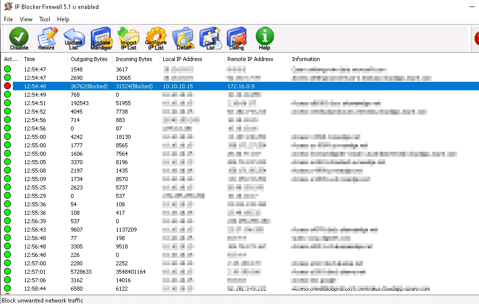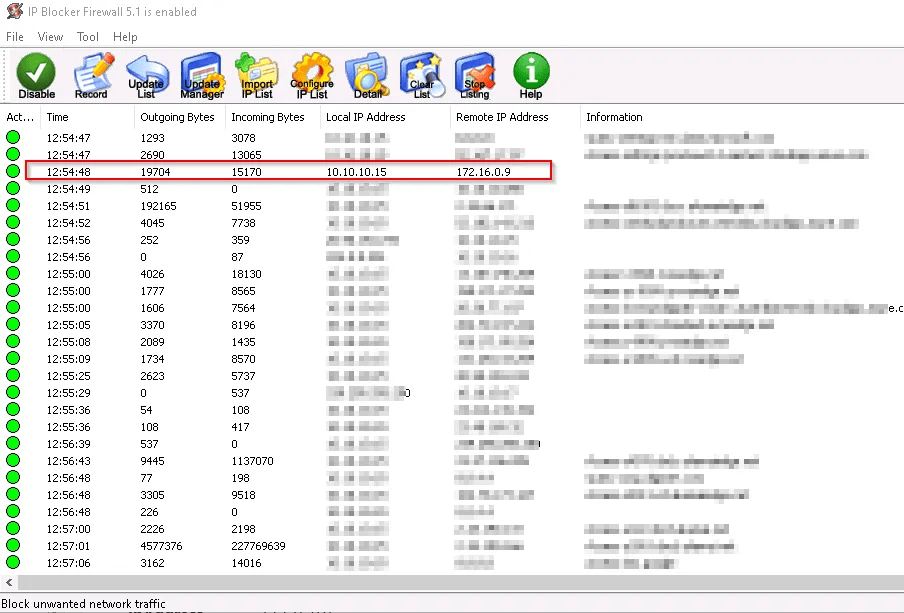 In previous steps, the attacker IP was identified. The IP Blocker Firewall tool not only shows the attacker IP but also the high out and incoming traffic.
