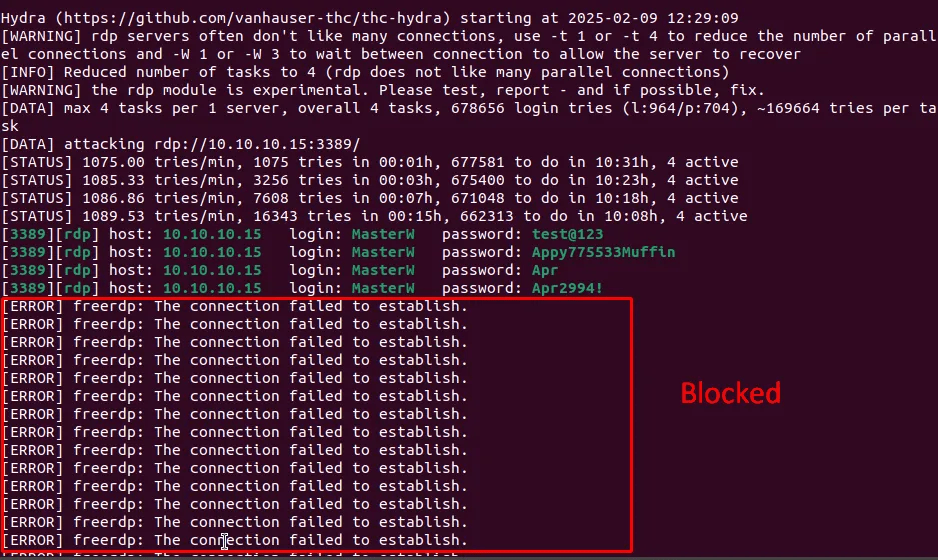 From attacker machine, it can be observed they can’t establish burtforce attack.
