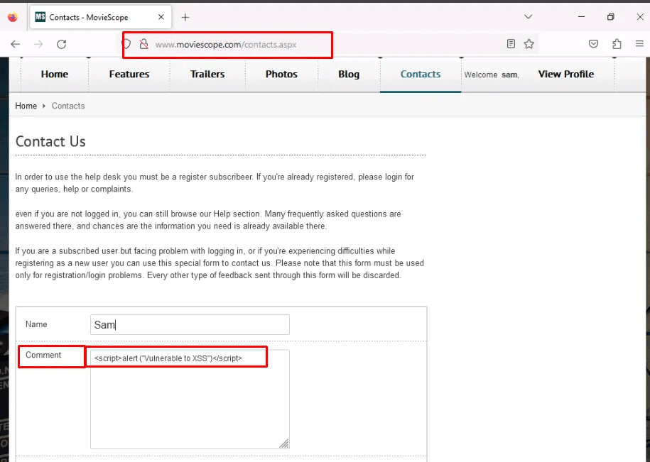Once logged in, navigate to contact us, in the comment section when typing the below basic JavaScript code and submit it.