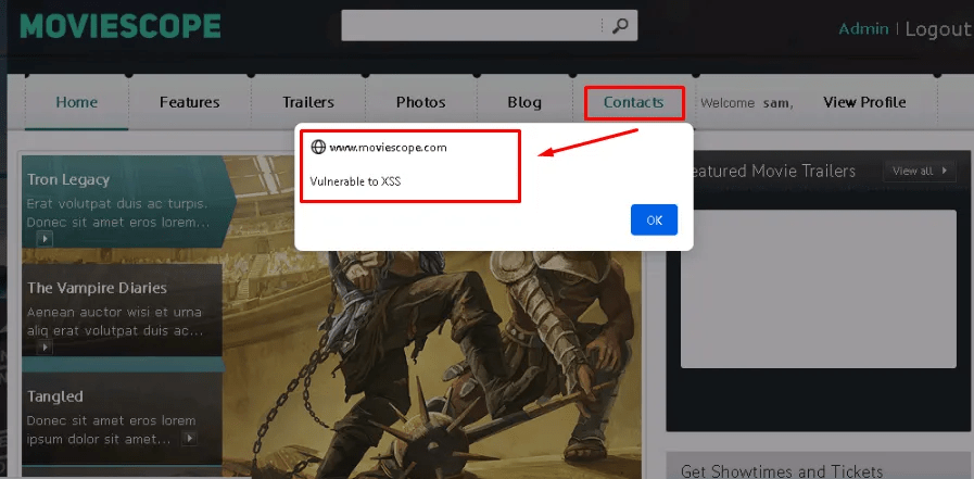When another user navigates to the contacts page, they get a pop up saying it vulnerable to XSS – a malicious actor could type anything that could trick the user. In particular, steal session cookie that contains log-in credentials.