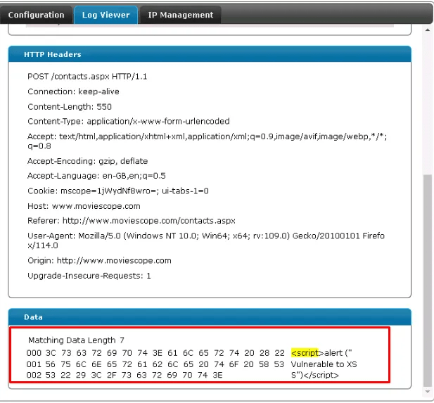 Users has continuedly reported the contact page shows the above pop-up. Also, logs in the WAF (Web Applicaiton Firewall) shows cross-site scripting is occured.
