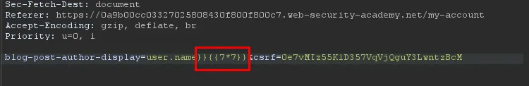 To confirm SSTI execution, a simple payload {{7*7}} was issued, which successfully evaluated and returned the expected result.